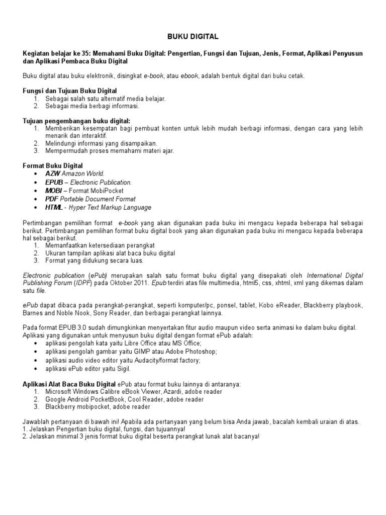 Aplikasi yang digunakan untuk menyusun buku digital dengan format epub adalah: Berbagai kelebihan yang ditawarkan telah menjadikan epub sebagai salah satu format buku digital yang paling banyak digunakan. · aplikasi audio editor yaitu audacity/format factory; Teks yang menjadi hakikat buku dapat disimpan dalam bentuk digital. Berbagai kelebihan yang ditawarkan telah menjadikan epub sebagai salah satu format buku digital yang paling banyak digunakan.